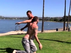 Latino guys with chiseled bods give head outdoors